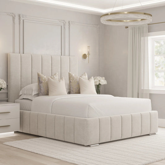 Tone on tone bedding and tall lamps keep things airy. A high headboard can make the room feel designed when walls are tall enough. For compact rooms, choose slimmer bedsides.